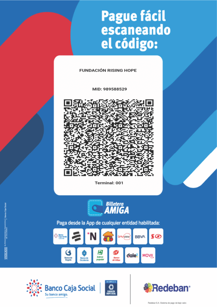 desde cualquier banco sin costo por la transacción y posteriormente favor envía comprobante de pago al correo risinghopefundacion@gmail.com